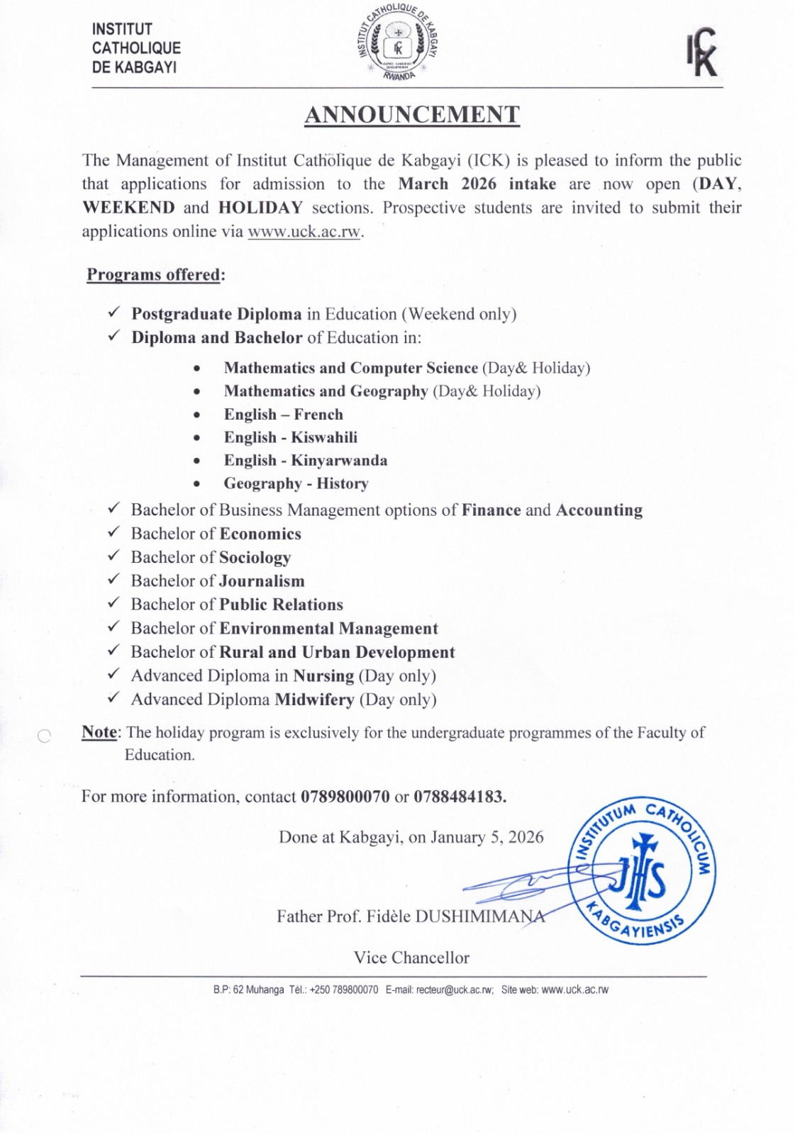 We are pleased to inform the public that applications for admission for March 2026 intake are now open for DAY, WEEKEND and HOLIDAY sections.