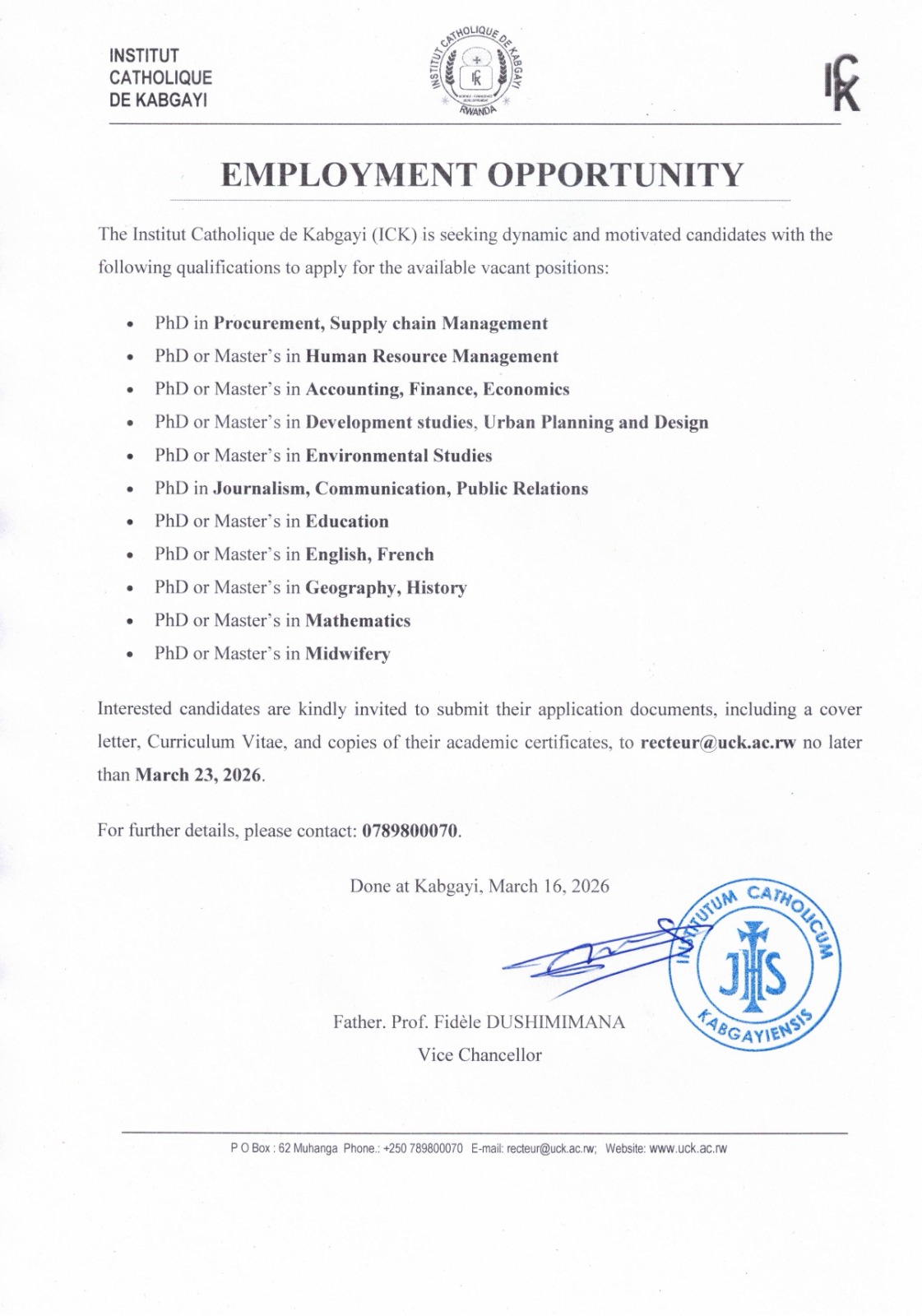 The Institut Catholique de Kabgayi (ICK) is seeking dynamic and motivated candidates